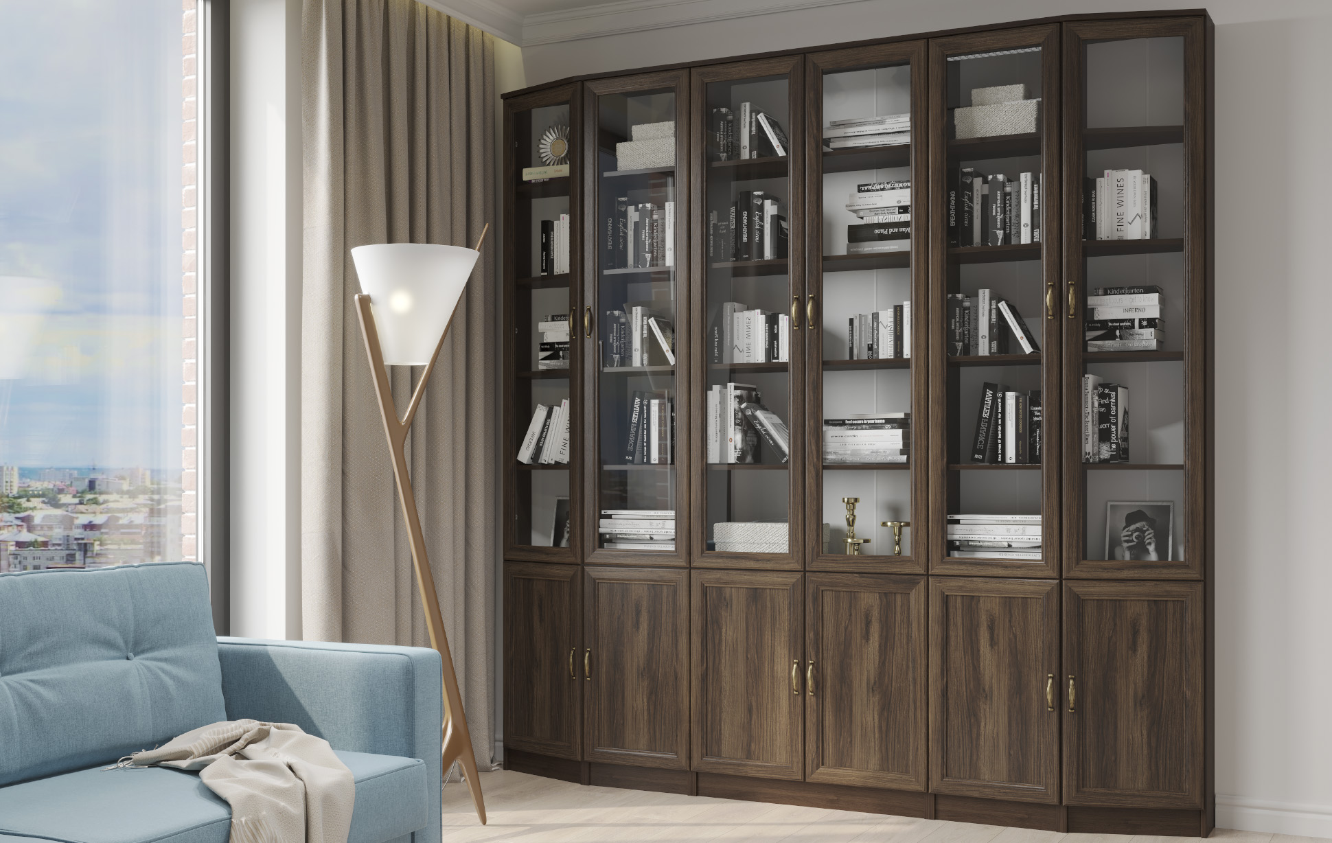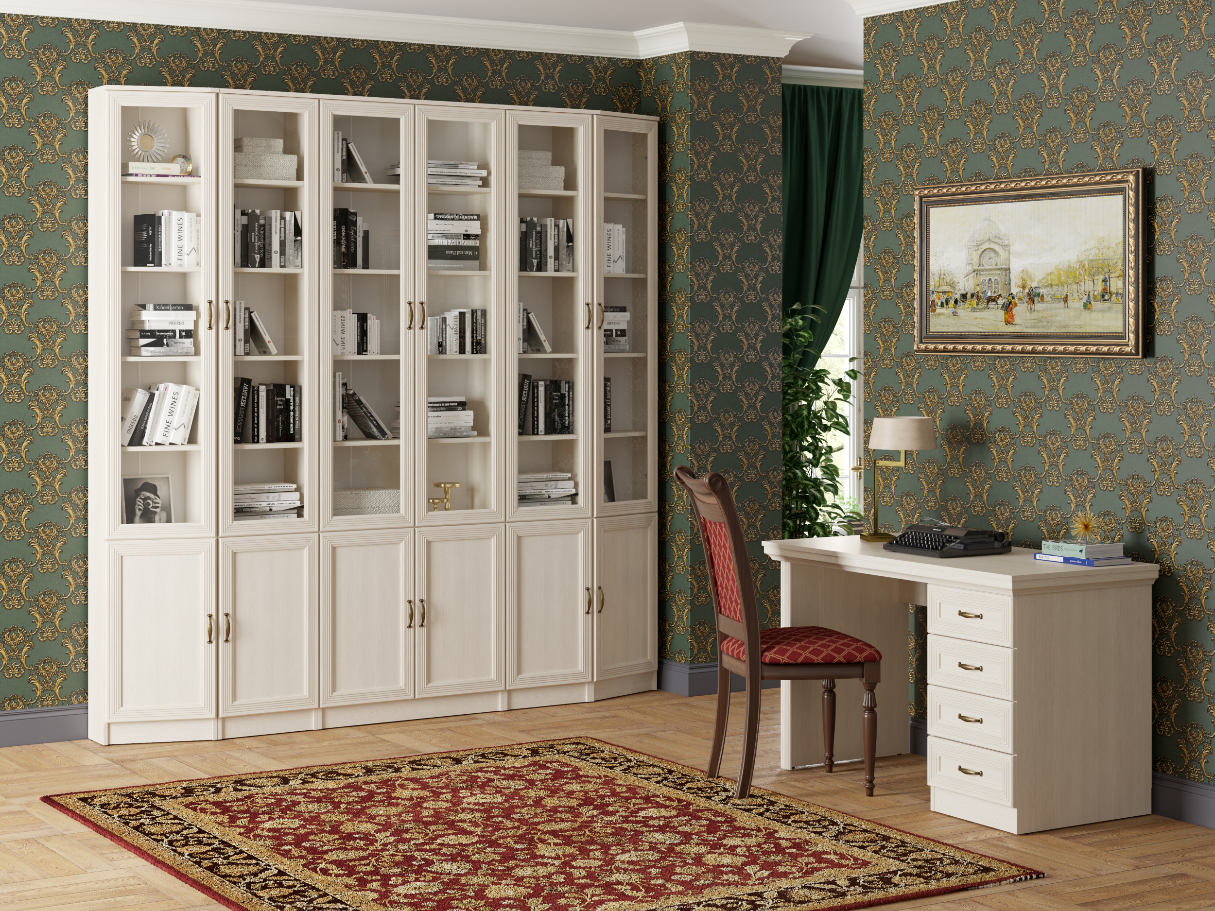 По краям расположены два аналогичных шкафа с открытыми полками и скругленными внешними контурами, которые придают библиотеке изысканности и элегантности. Центральную часть комплекта занимают шкафы с двойными секциями и распашными створками. Библиотека позволит скрыть самые ценные изделия и предметы за сплошными дверцами внизу, а на верхних полках за стеклянными дверями превосходно разместятся книги и элементы декора.